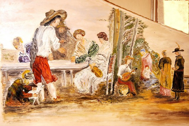 in white with wooden applications and huge painting inside the lid. The