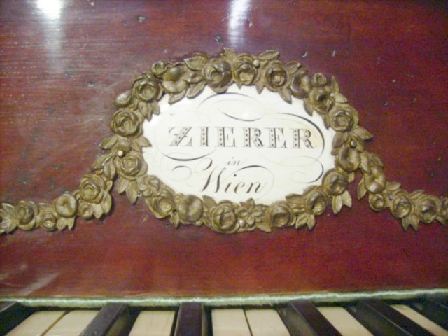 dampers are missing, one pedal for the dampers, enamel plaque on nameboard reads "Anton Zierer / Wien"