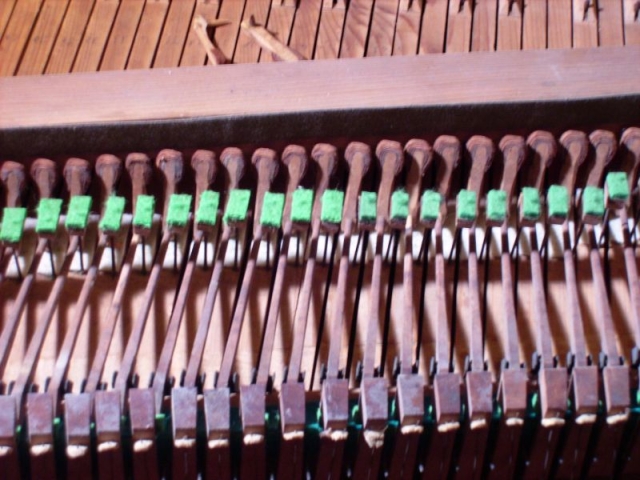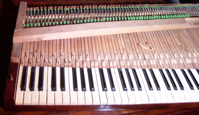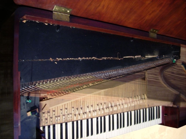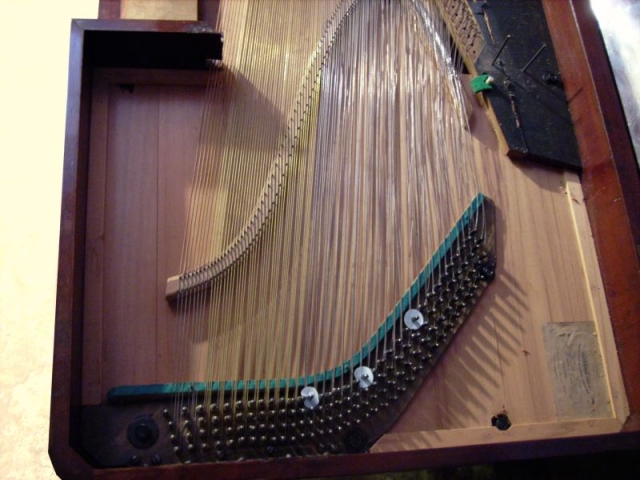 modern tuning pins and strings. The instrument shows past repairs and is in need of restoration,